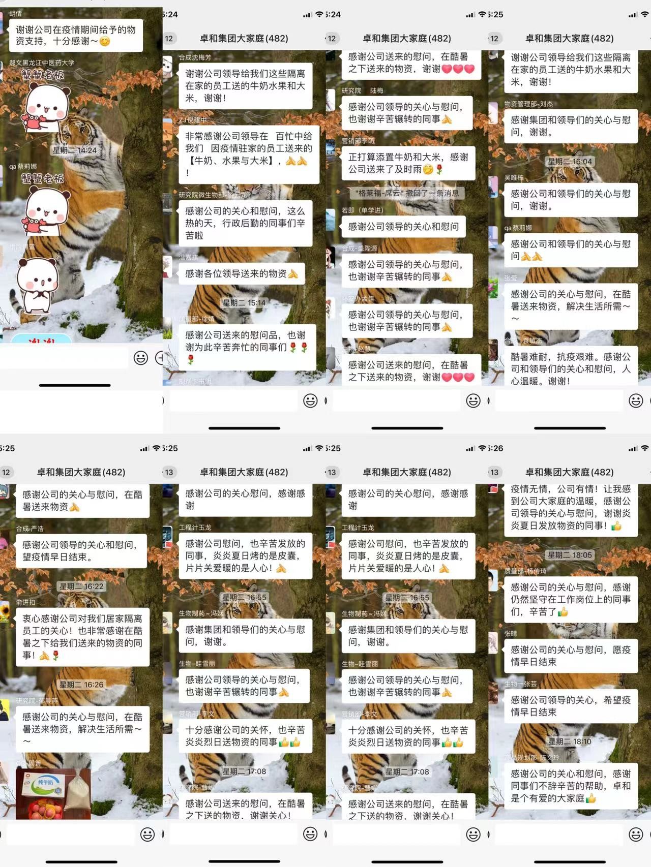 “我兒子說要感謝爸爸的單位,居家隔離期間送來了物資,滿滿的愛與感動,愿疫情早日結(jié)束,無錫加油!”“感謝公司的關心和慰問,感謝同事們不辭辛苦的幫助,卓和是個有愛的大家庭!”……當天,卓和藥業(yè)集團大家庭熱鬧起來,在收到慰問品后,隔離的員工紛紛表達了對公司的感謝。