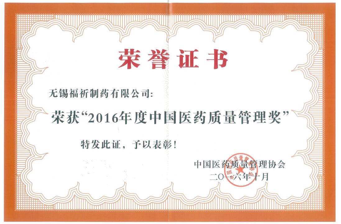無錫福祈制藥有限公司榮獲2016年中國醫(yī)藥質(zhì)量管理獎(jiǎng)